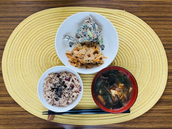 アマランサスご飯 わかめの味噌汁 切干大根のチャプチェ 納豆和え いりこ