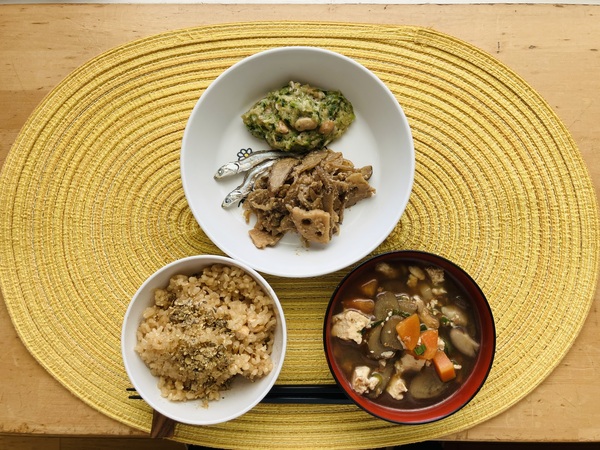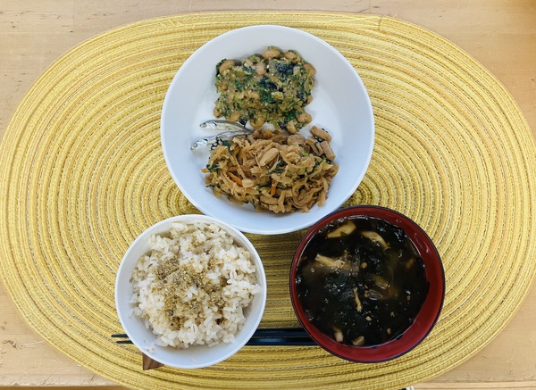 生姜ご飯 味噌けんちん汁 ベジミート入りきんぴらごぼう 納豆和え いりこ