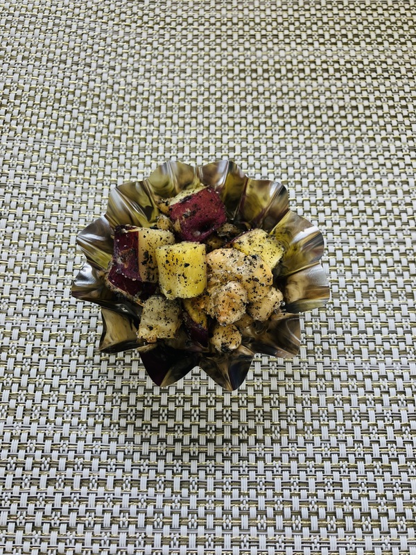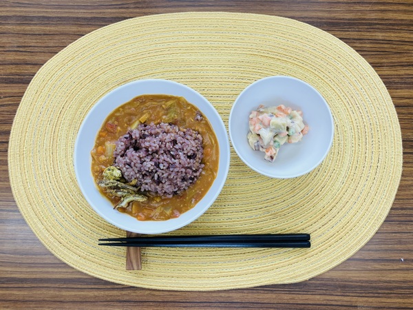 雑穀ご飯 根菜カレー いりこフライ さつま芋の豆乳ドレッシングサラダ
