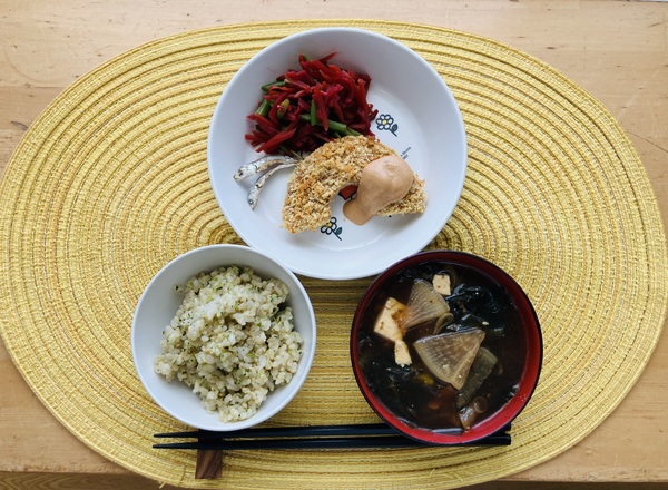 青菜ご飯 大根の味噌汁 車麩のフライ 切干大根の和え物 いりこ