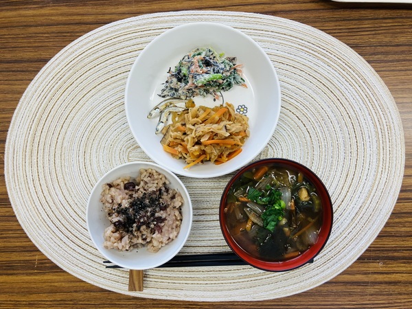 小豆ご飯 五色の味噌汁 切干大根の煮物 白和え いりこ