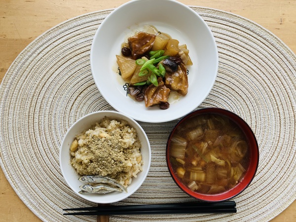 大豆ご飯 ねぎの味噌汁 車麩の角煮風 いりこ