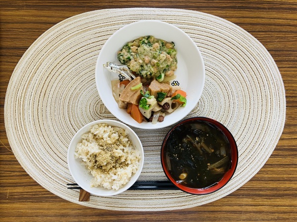 キヌアご飯 海藻の味噌汁 蓮根と車麩の煮物 納豆和え いりこ