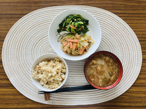 中華ご飯 ねぎの味噌汁 春雨炒め 菜の花のナムル いりこ