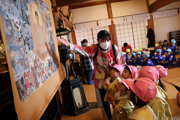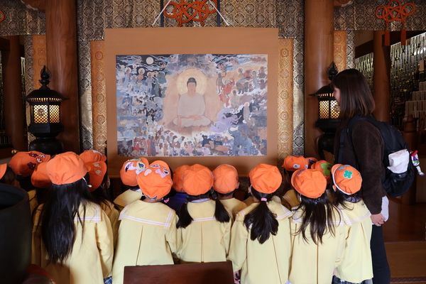 12月8日は成道会。お釈迦様が「どのようにすれば皆が仲良く幸せに暮らせるのか」とお悟りになった日です。園長先生のお寺・円福寺に全園児で行き、本堂で手を合わせました。紅葉が美しい境内を散歩したり、晴れやかな一日になりました。