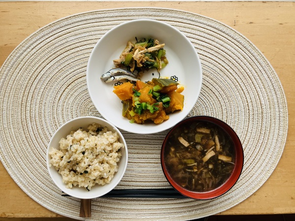 わかめご飯 ねぎの味噌汁 かぼちゃと車麩の煮物 切干大根と青菜の和え物 いりこ