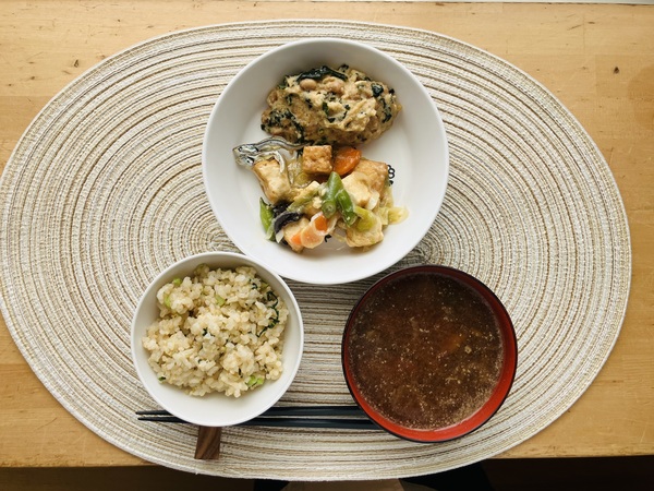 青菜ご飯 ごぼうの味噌汁 厚揚げの生姜蒸し 納豆和え いりこ
