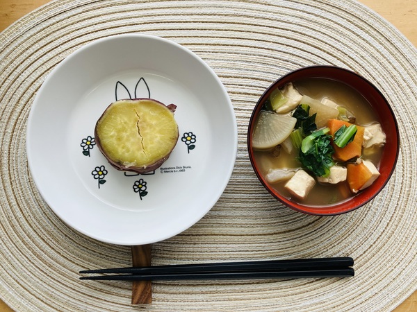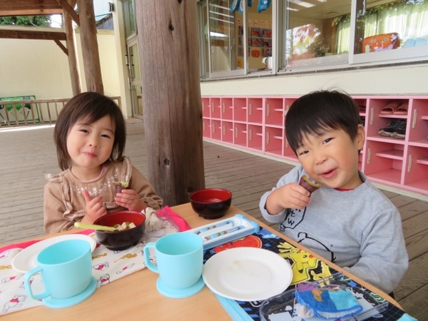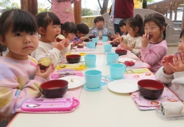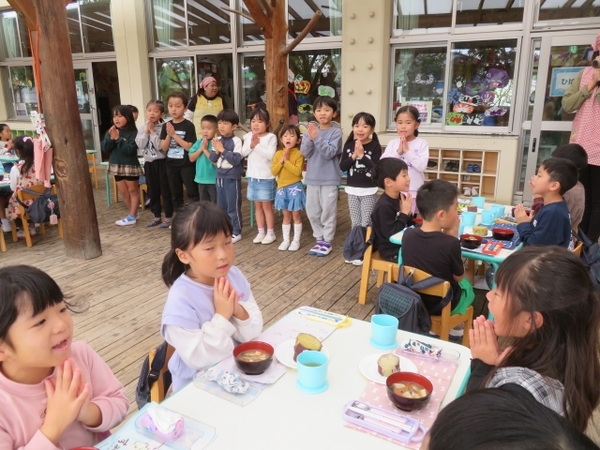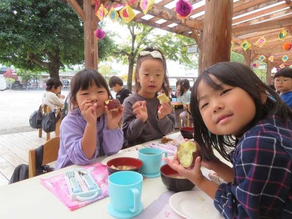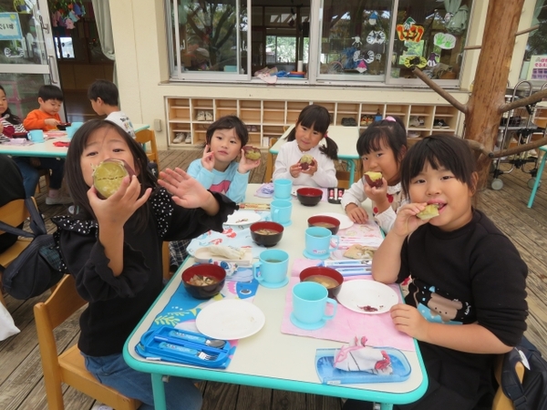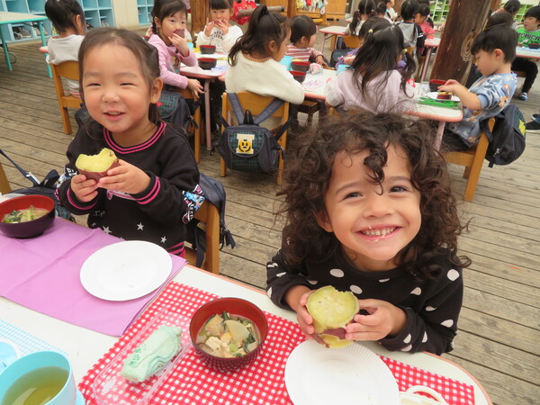 おいもほりのさつまいもを給食室でふかしてもらい、けんちん汁とともにいただきました。全園児テラスに机を並べ、学年ごとの自由な席でいただくいも煮会は最高のお味です!
