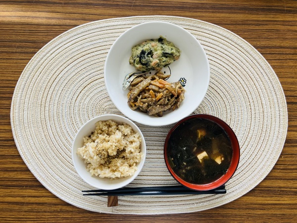 キヌアご飯 豆腐の味噌汁 豚肉入りきんぴらごぼう 納豆和え いりこ