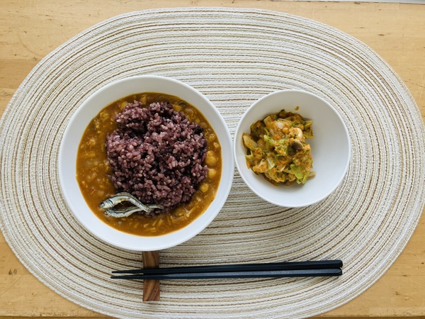 黒米ご飯 お豆のカレー 人参ドレッシングサラダ いりこ
